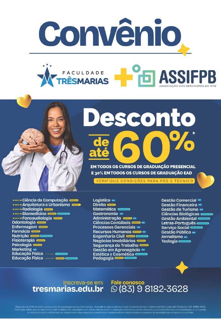 Novo Convênio Educacional ASSIFPB + Faculdade Três Marias A ASSIFPB tem a satisfação de anunciar mais uma importante parceria voltada à formação e qualificação dos(as) seus(suas)